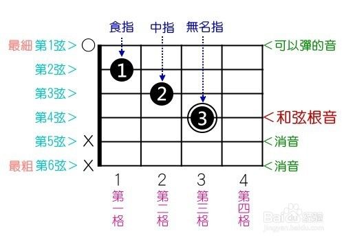 根音是什么?简单的说,根音就是这个和弦组成中最低的音。以下是吉他前三格的音阶位置图。如果你还不知道和弦的根音或主音位置,建议可以把下表印起来,贴在吉他侧板,忘记了就低头看一下。如果看懂和弦图表,可以自己先压压看,从根音开始,一条一条慢慢的往下弹。