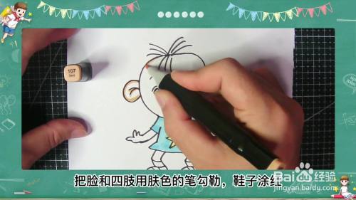 最后把五角星涂上黄色,衣服涂成蓝色,把脸和四肢用肤色的笔勾勒,鞋子涂红。这样可爱的大耳朵图图就画好了。