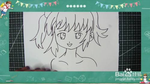 接着在脸上画出大眼睛,还要画出一个嘴巴。然后向下画出细长的脖子,再用弧线连接画出肩膀,画两条斜线是锁骨。