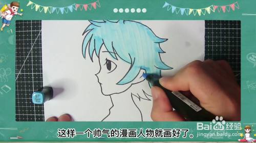 最后给他的头发涂上蓝色,皮肤部分用肤色的画笔勾勒。这样一个帅气的漫画人物就画好了。