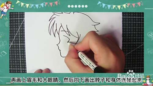 再画上眉毛和大眼睛,然后向下画出脖子,让他和身体连接起来。