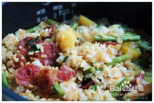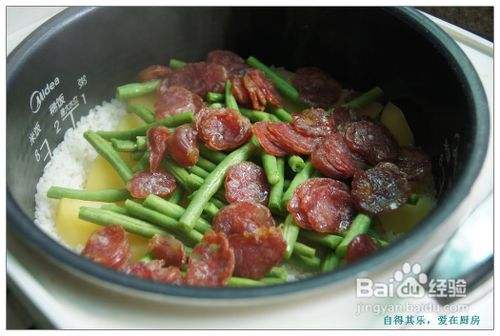 豇豆洗干净,摘好,电饭煲里水快烧干的时候,放入豇豆、腊肠。腊肠一定要这个时候放,要是早早就放进去跟饭一起煮,那味道可差多了。放好之后再盖上盖子继续焖。
