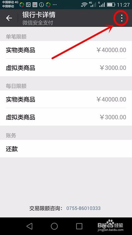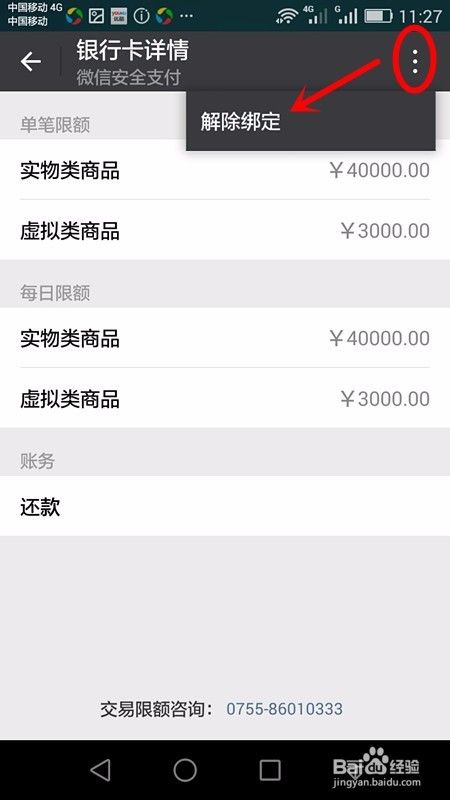 第六步:在【银行卡详情】页面,点击右上角竖着的吐蹲爹三个点的图标,然后点击【解除绑定】如图。