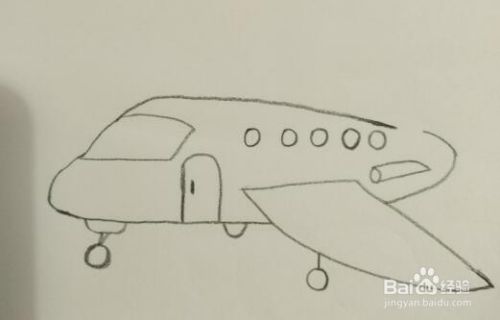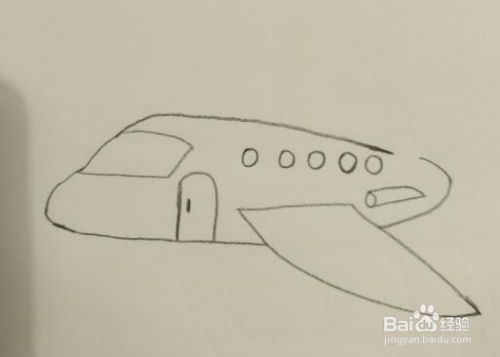 画好后,我们再在机身的一侧画出飞机的机翼,像一个鸟翅膀,画法如图。