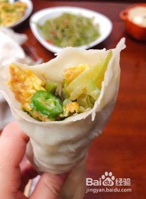 河南的烙馍是要卷菜吃的。土豆丝,辣椒炒鸡蛋,绿豆芽是最简单最家常的配菜。