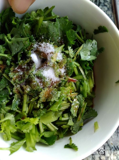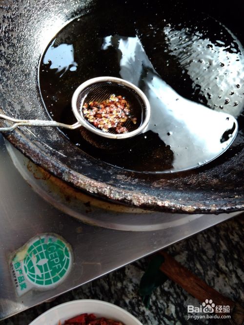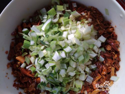 油温高后,把有倒入辣椒。加入葱、香菜,