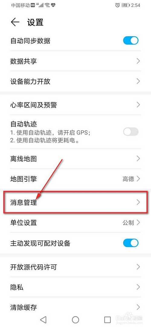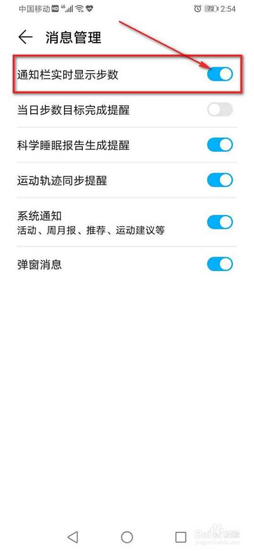 第四步:点击“消息管理”,点亮“通知栏实时显示步数”旁的小滑块。