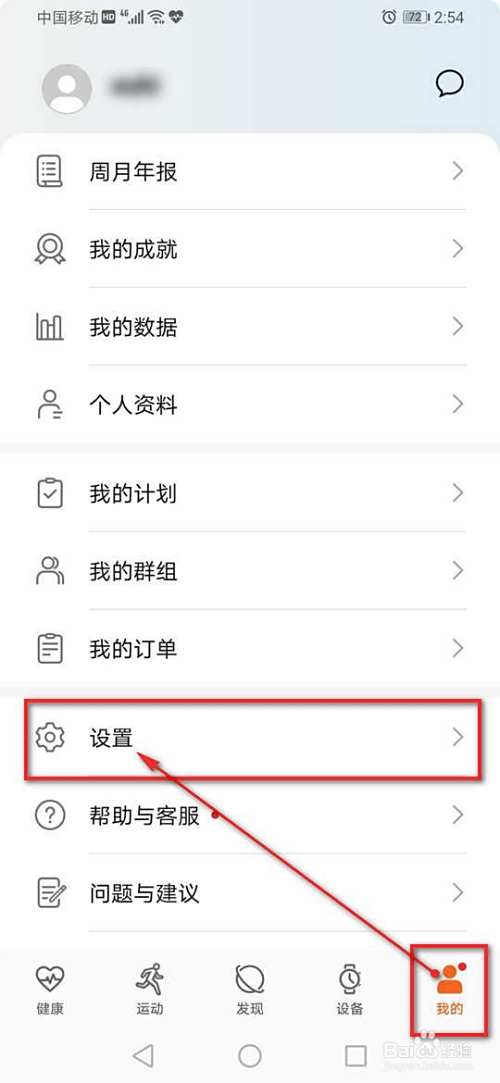 第三步:点击“运动健康”,点击“我的”-“设置”。