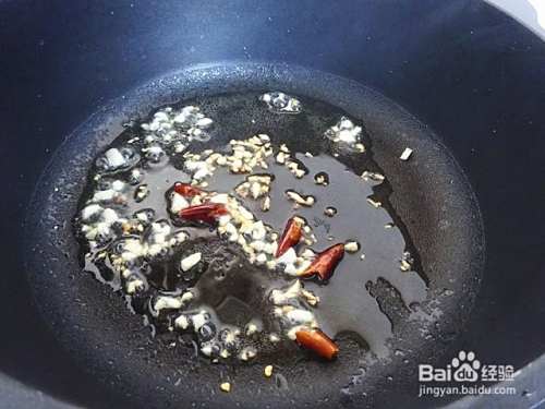 大蒜切碎,辣椒直接掰断,炒锅热油,爆香大蒜粒和干辣椒。