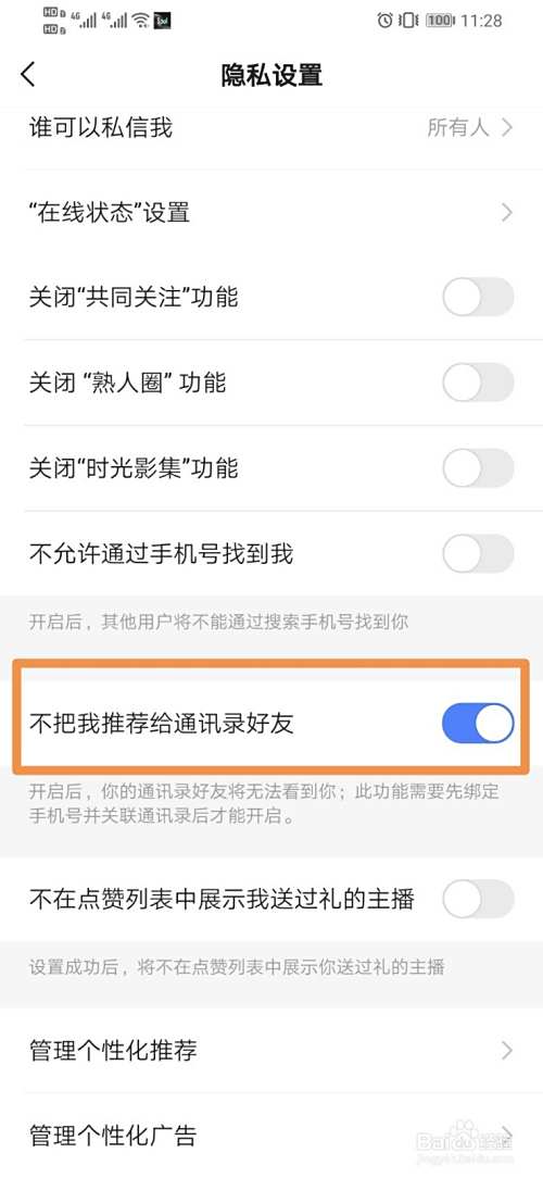 最后点击【不把我推荐给通讯录好友】,右边白色按钮【开启】即可。