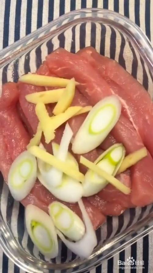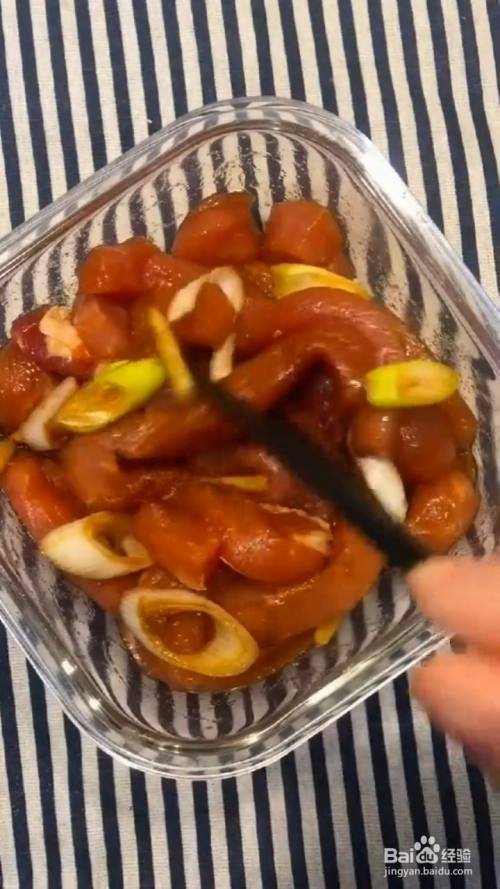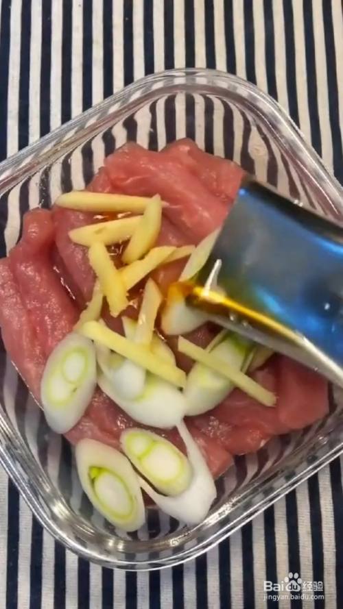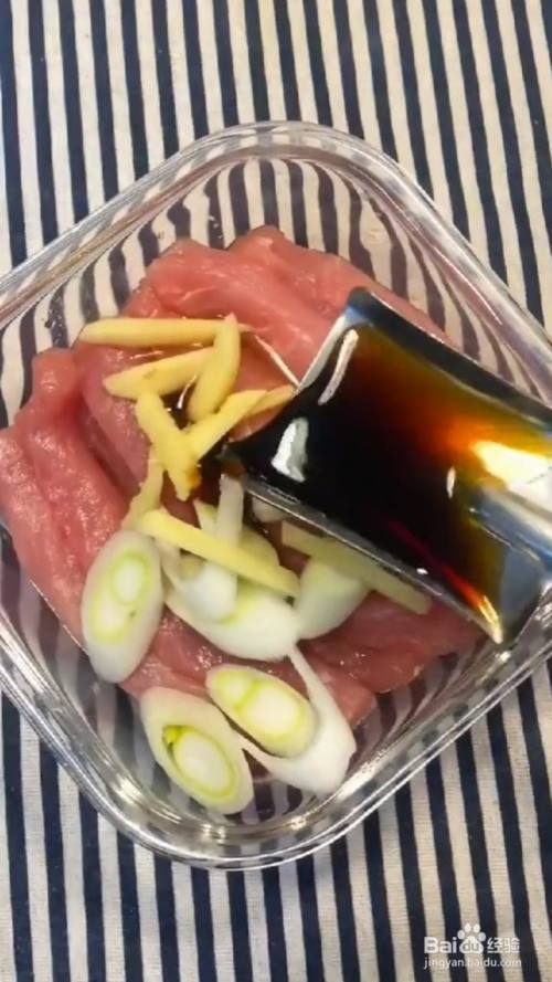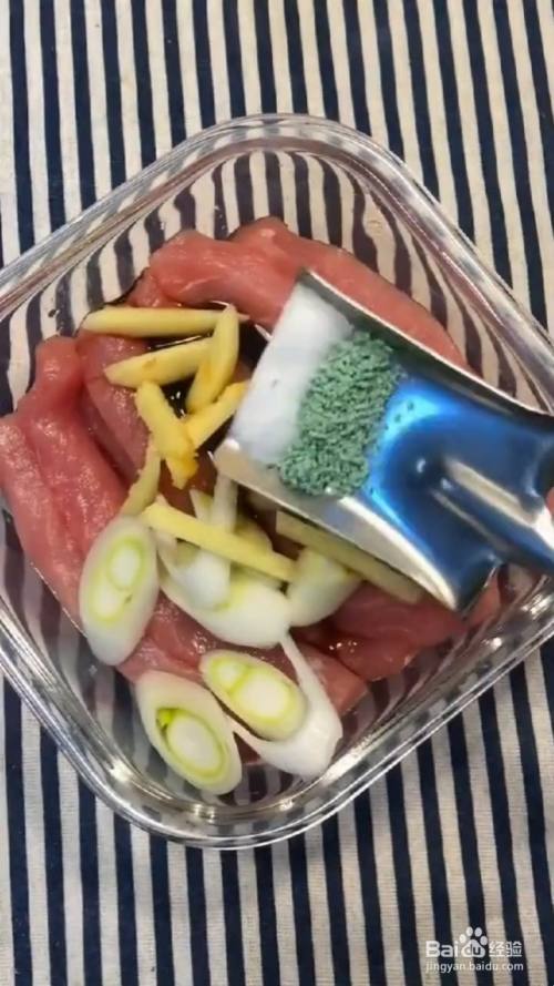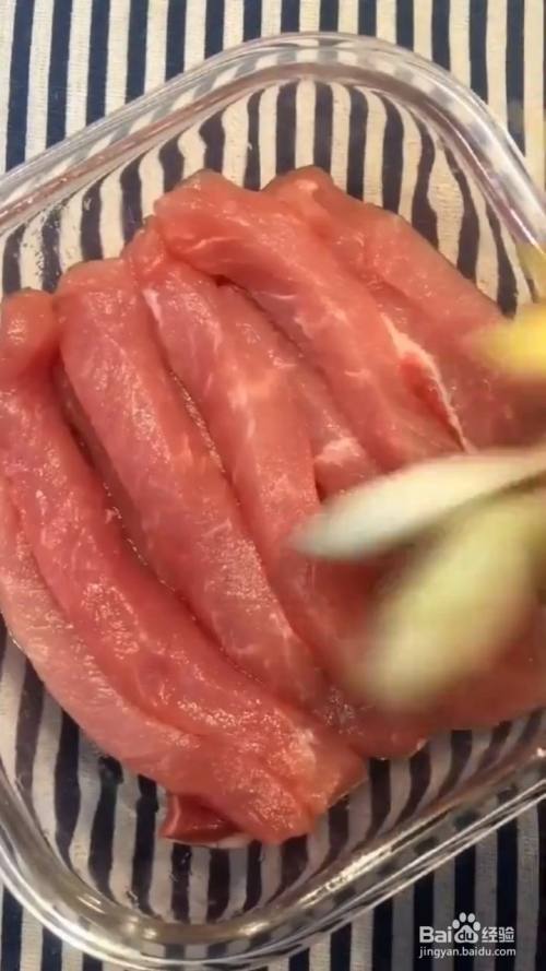 准备一块里脊肉,切成小长条,加入2克葱姜,1勺料酒,1勺生抽,1勺盐,1勺鸡精,1勺白糖,搅拌均匀,腌制20分钟