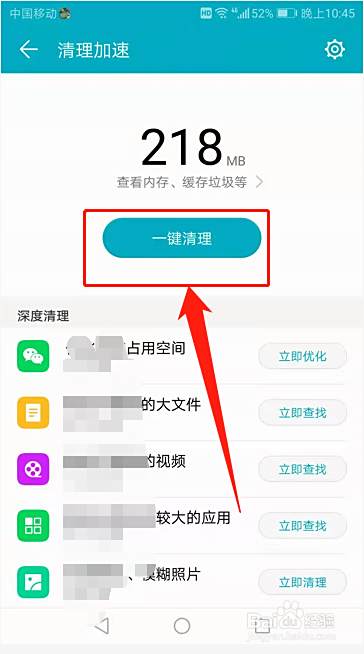 清理内存页面,选择“一键清理”,内存清理完成就可以解决手机卡顿反应慢问题了。