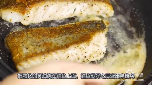 锅中烧油,鱼皮朝下放入鳕鱼,煎至定型之后翻面,煎至两面金黄之后放入黄油,把融化的黄油浇在鳕鱼上面,鳕鱼煎好之后盛出来备用。