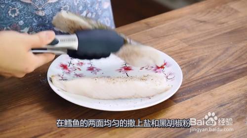 在鳕鱼的两面均匀的撒上盐和黑胡椒粉,在上面撒上一层面粉,用手将面粉均匀的抹在鳕鱼上面。