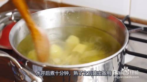 锅中烧水加入食盐,放入土豆块,水开后煮十分钟,熟了之后盛出备用。