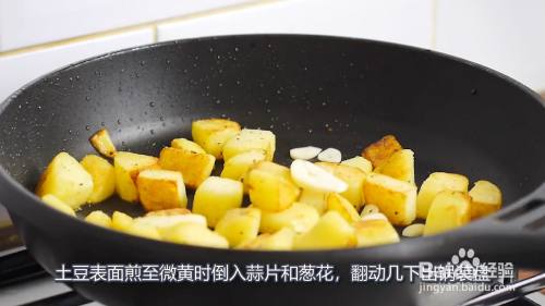 锅中加入适量的食用油,倒入土豆块,撒上黑胡椒和盐,土豆表面煎至微黄时倒入蒜片和葱花,翻动几下出锅装盘。