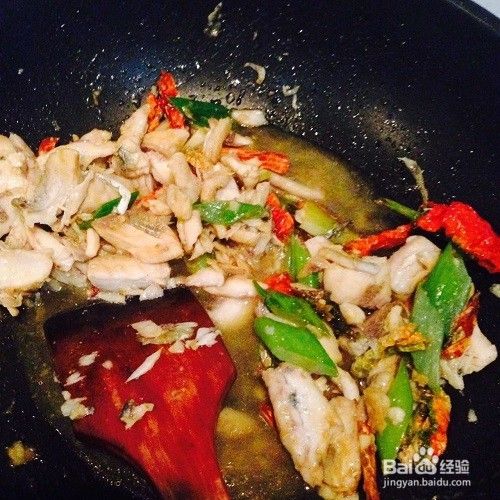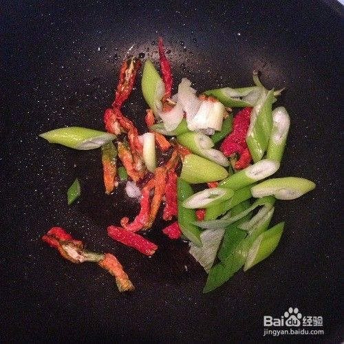 用炒鱼剩的底油,下入干红辣椒和葱爆香,爆香后再倒入事先炒好的鱼一起大火煸炒。