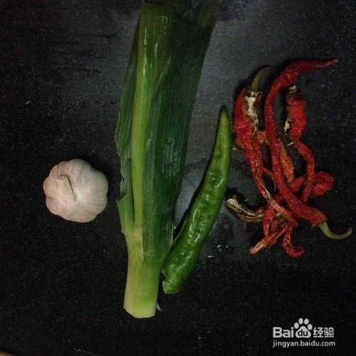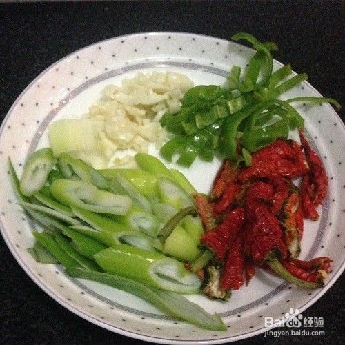 准备好青红辣椒、大葱和蒜。分别将大葱和干红辣椒切段,青辣椒切丝、蒜切成泥装盘备用。