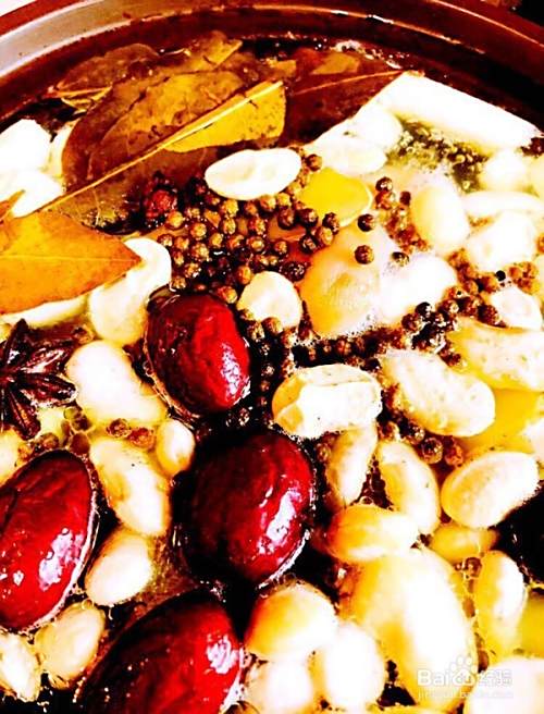 炖锅中放冷水,然后依次放入猪蹄、葱、姜、八角、红枣、香叶、白芸豆、花椒、还有盐