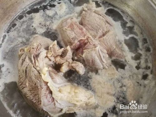 牛肉泡好后,放锅里,加水加料酒烧开,煮五六分钟,捞电压力锅里面。