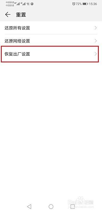 第四步在重置界面,选择恢复出厂设置,如下图所示: