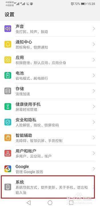 第二步如果重启手机之后,还找不到,可以使用手机管家进行病毒查杀和清理垃圾一下,还没有出现的话,就只能恢复出厂设置,点击设置->系统,如下图所示: