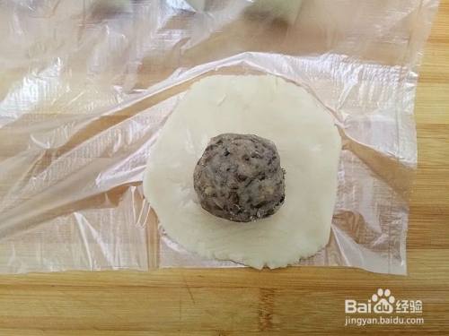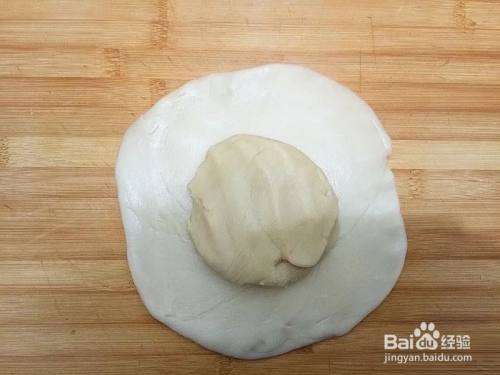 松弛好的水油皮稍微压扁,放上团圆的油酥面团