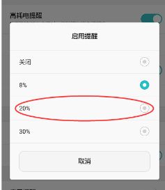 电池设置中,选择下面的启用提醒,点击进入,选择启用提醒设置,点击选择20%,即可在手机电量剩20%的时候出现低电量提醒。
