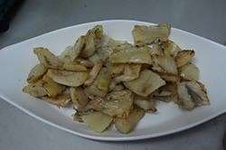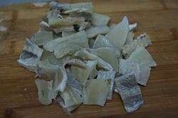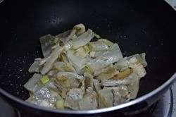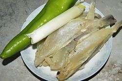 锅里放油烧热,下大葱炒香,然后放入咸鱼干翻炒