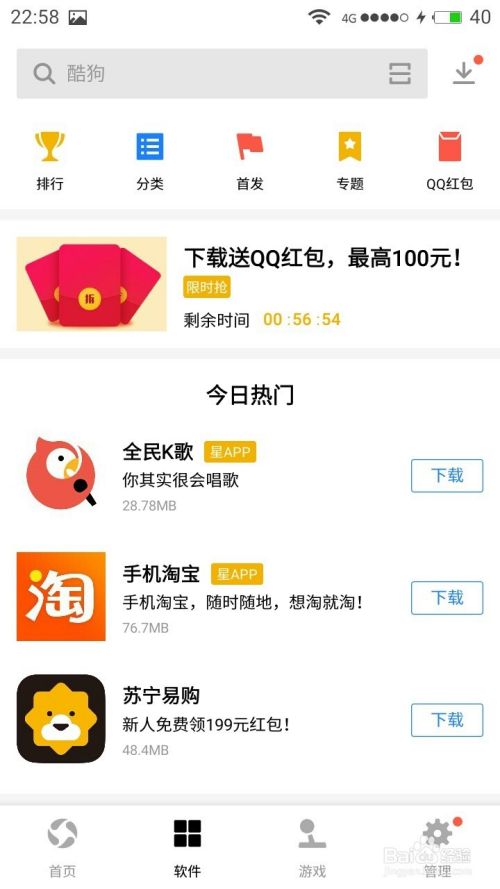 首先,这个软件是应用宝首发的所以需要下载一个应用宝,打开下面软件分类
