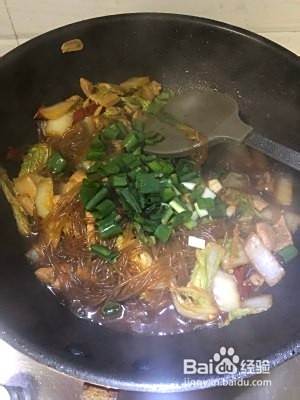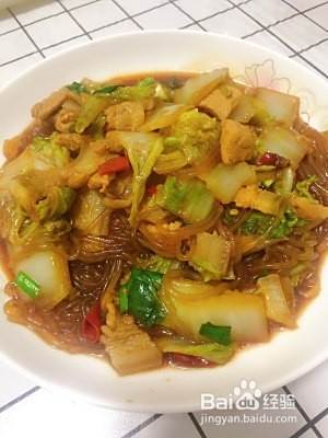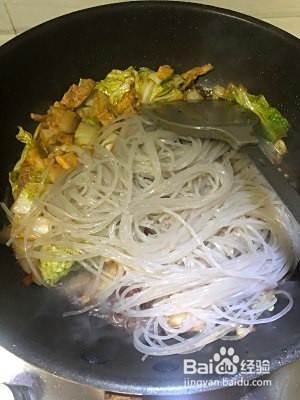 粉丝提前温水泡好,大概半小时,五花肉切片,白菜切小片洗干净,葱蒜姜辣椒切好备用,热火倒油少许,因为五花肉里有猪油,翻炒全白,加入料酒去腥