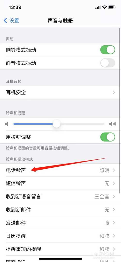 接着我们打开声音与触感页面后,点击选择“电话铃声”,进入一个新的界面中。