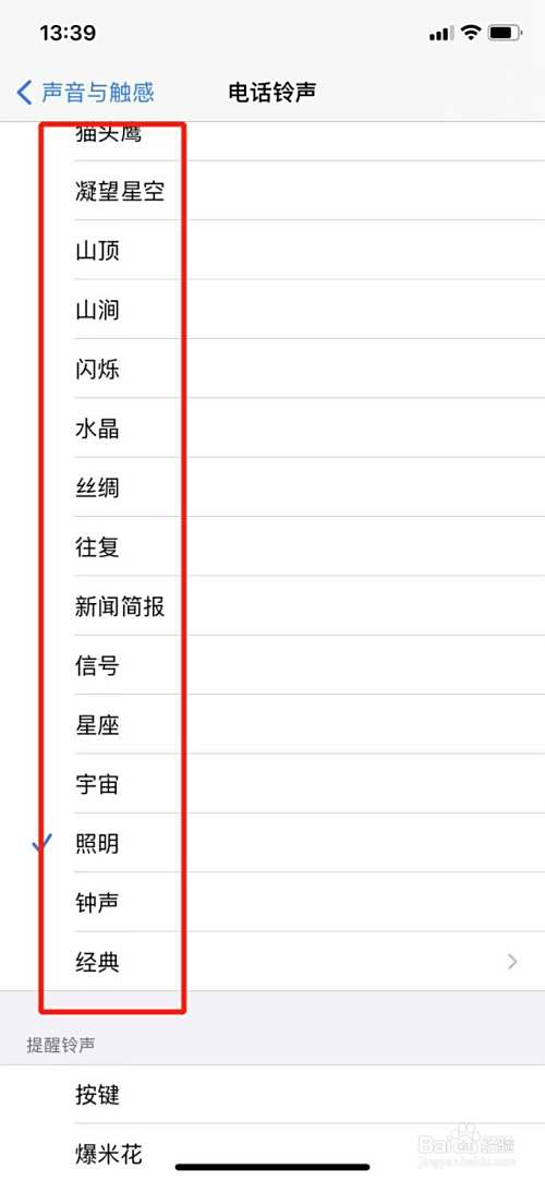 iPhone手机在声音与触感的电话铃声界面,选择铃声进行设置。具体的操作步骤如下: