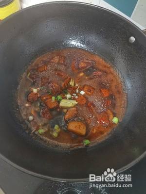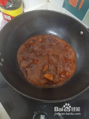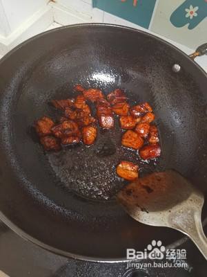 将肉倒入锅中,冰糖是为了好上色。
