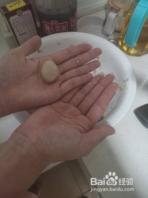 将刚才和好的红薯粉,取一点在手中搓成这个圆形下锅。