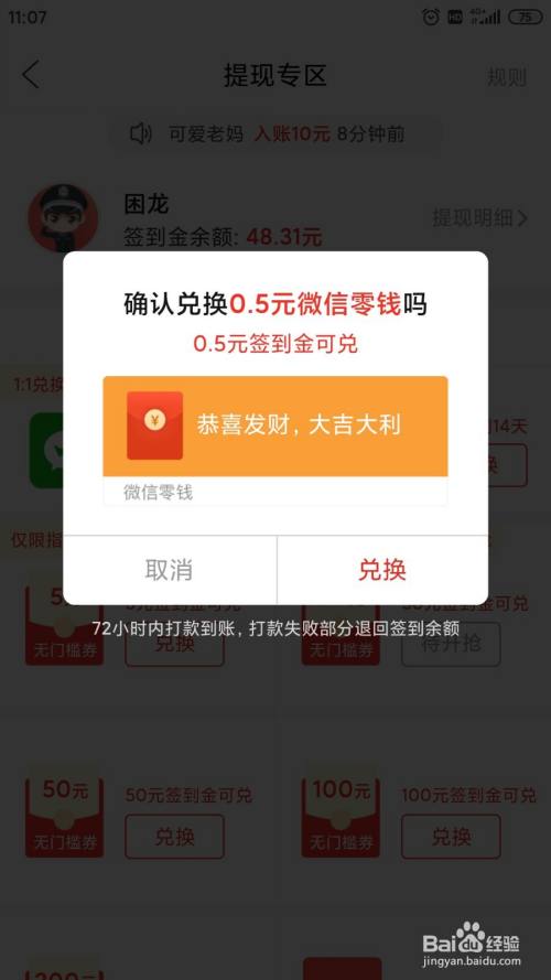 兑换成功以后,系统会进入到72小时以内将兑换的金额打到微信零钱中。