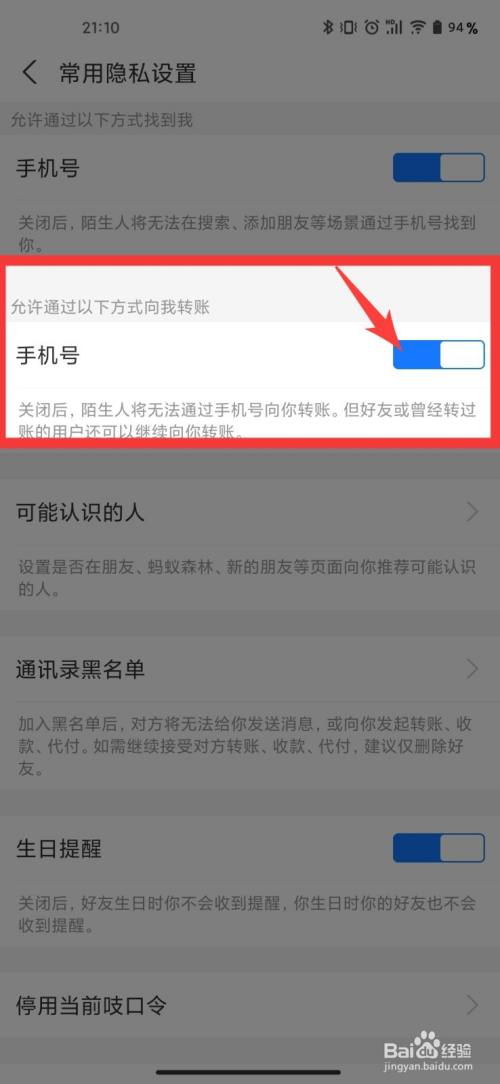 点击常用隐私设置之后,开启通过手机号向我转账。
