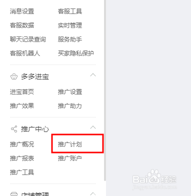 如图所示:进入拼多多商家版网页中,在左面列框中向讨速下滑动,找到(推广中心)组中的(推广计划)按钮。