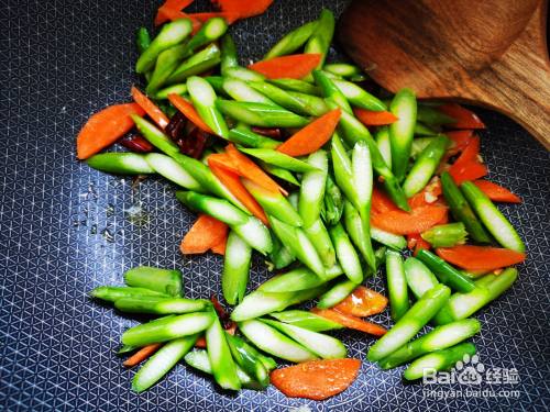 将准备好的芦笋和胡萝卜倒入锅中,开中火不断翻炒。如果觉得太干了可以加一点点水。