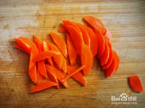将胡萝卜从中间切开成为两块,用平整的那一面放在案板上,然后斜刀将胡萝卜切成片,最后比较小的部位可以选择不用。