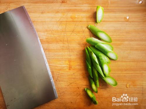 将芦笋按照斜刀切的方式切成小段,每一段大概1cm左右的厚度。