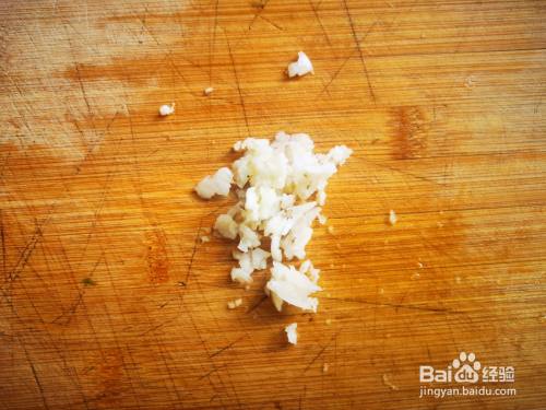 将大蒜剥皮,剥皮的时候可以借助菜刀将大蒜的根部先切掉,然后用到在案板上拍一下,这样大蒜的皮就直接分离出来了,然后切成蒜末。