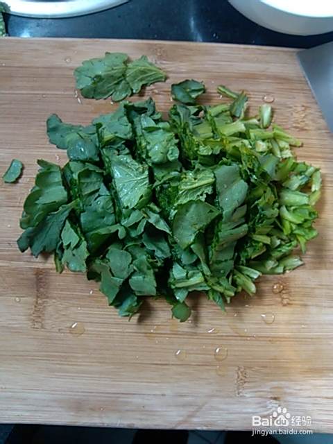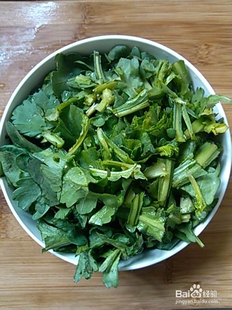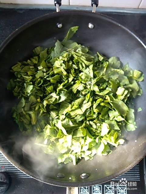 油热到快冒烟的时候放入蒿菜翻炒(放入些盐可以快速把蒿菜炒蔫):