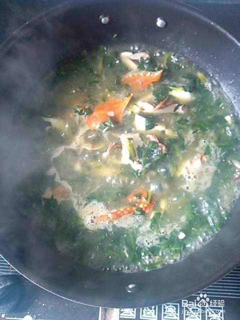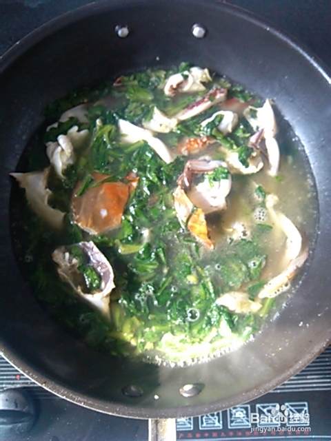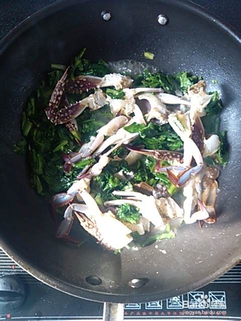 等蒿菜翻炒蔫了后放入螃蟹再翻炒: