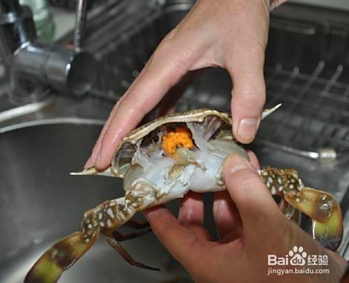 然后搬开壳,小心被螃蟹的大爪子夹到手: