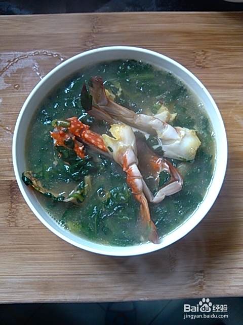 这样一道美味又营养的螃蟹蒿菜羹就做好了,出锅。