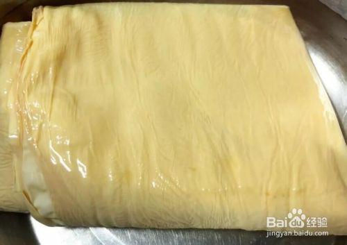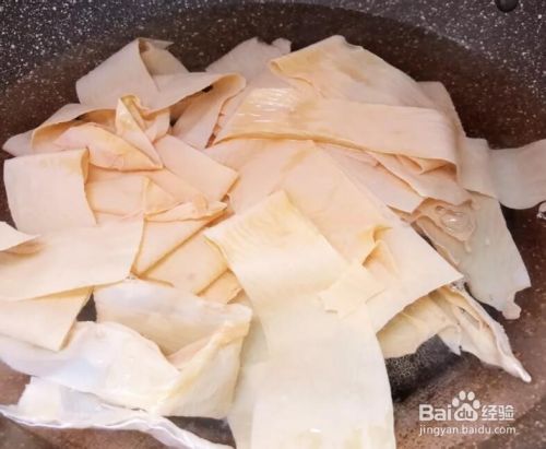 首先是将豆油皮泡入水中,大概三十分钟左右,让豆油皮完全泡透,然后切条备用。