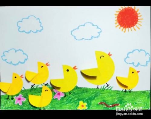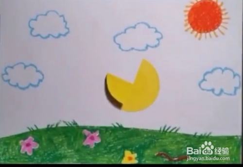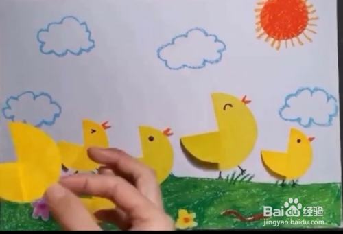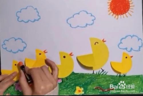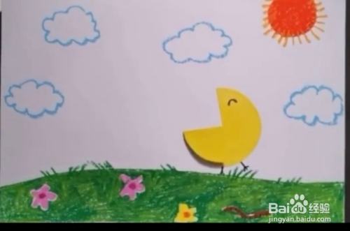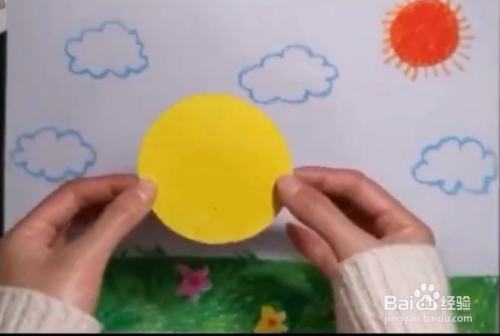 接着在上面空白的部分,我们换出太阳白云拿出一各个剪成圆形的黄色卡纸。
