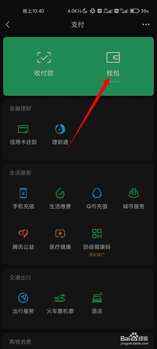 在支付页面,点击钱包的选项。