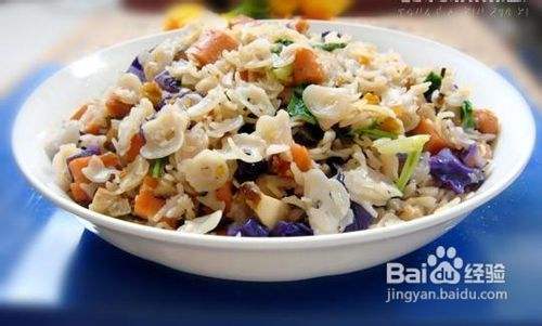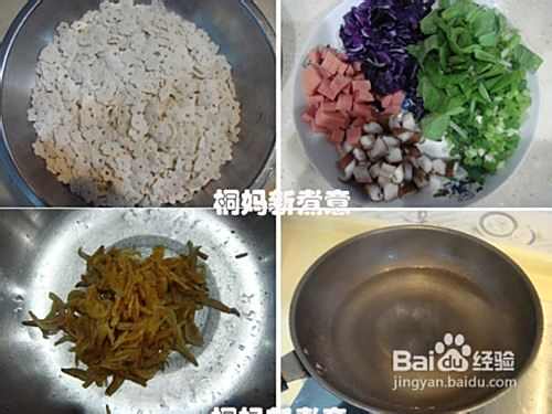 1.将香菇,火腿切丁,青菜,紫甘蓝切小块,虾皮洗净